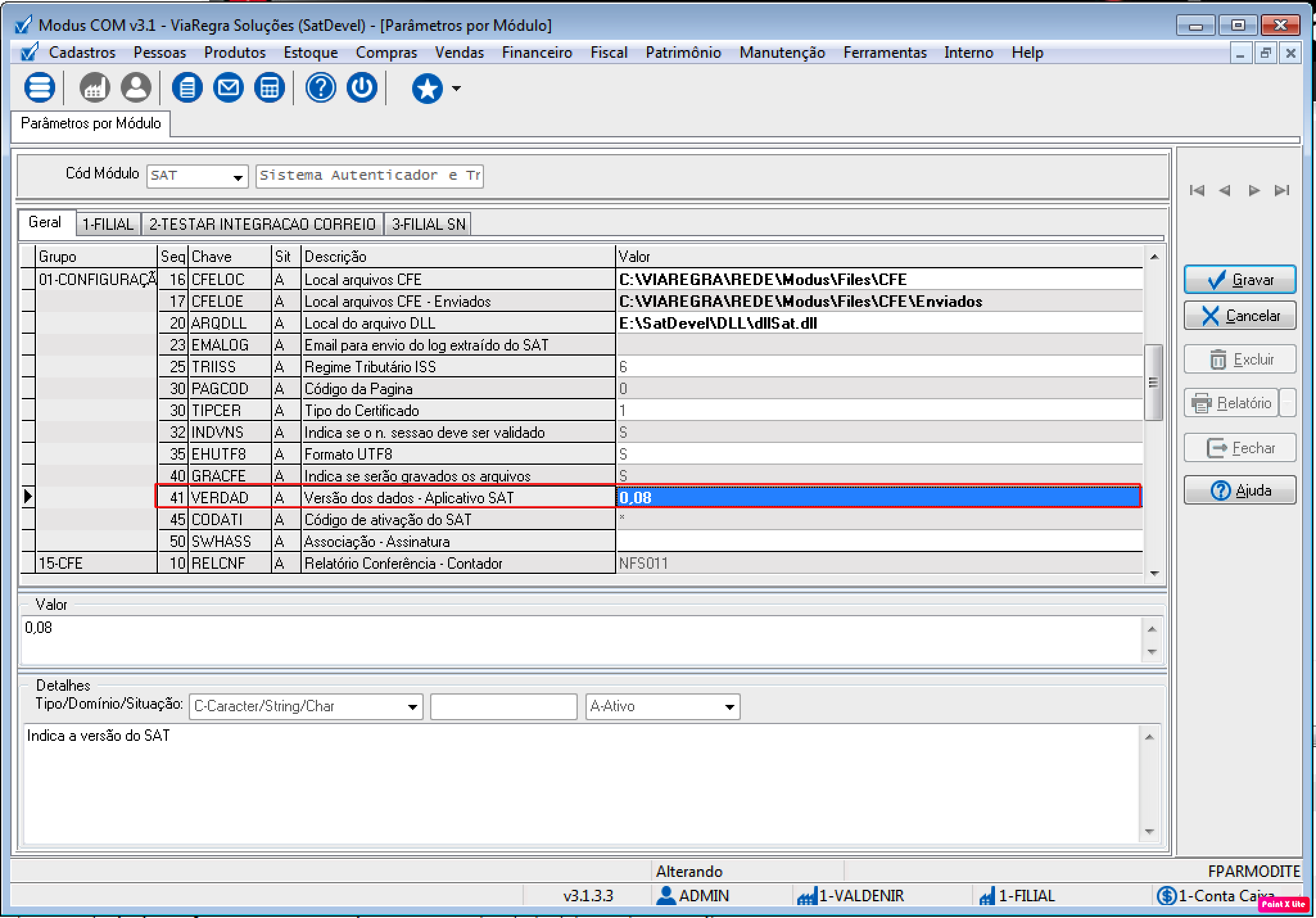 3. Para a geração do Cupom no leiaute 0.08 a Versão do Sistema ModusCOM deve ser v3.1.2.1 ou superior. Utilize o Parâmetro SAT.VERDAD para informar a versão do leiaute, mas ATENÇÃO esse parâmetro só deve ser alterado após atualizar a versão do aplicativo do equipamento descrita no item 2 .