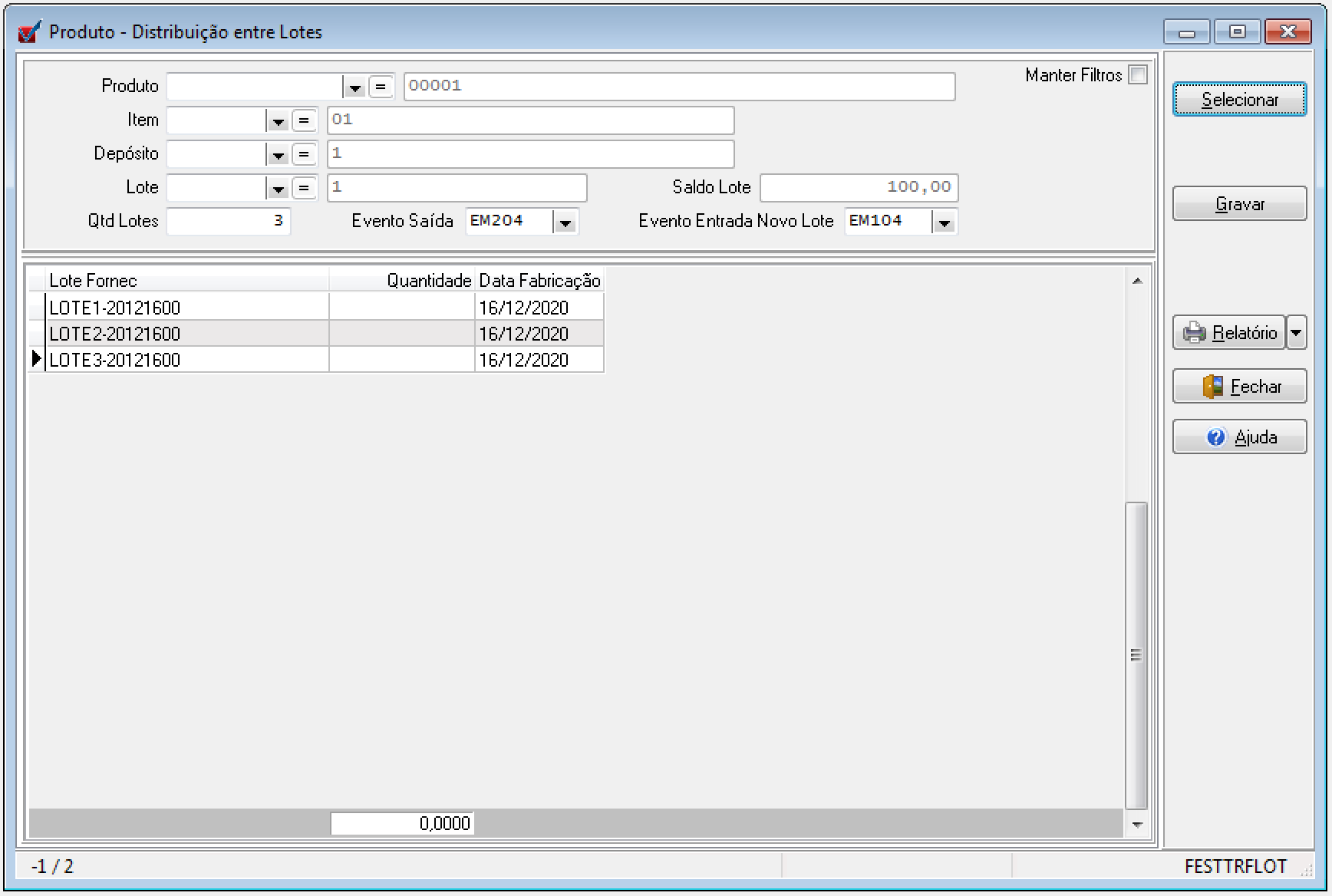 Deve ser informado o Produto/Item/Depósito/Lote que possui o saldo a ser transferido, na Grid é onde será informados os novos lotes e suas respectivas quantidades.