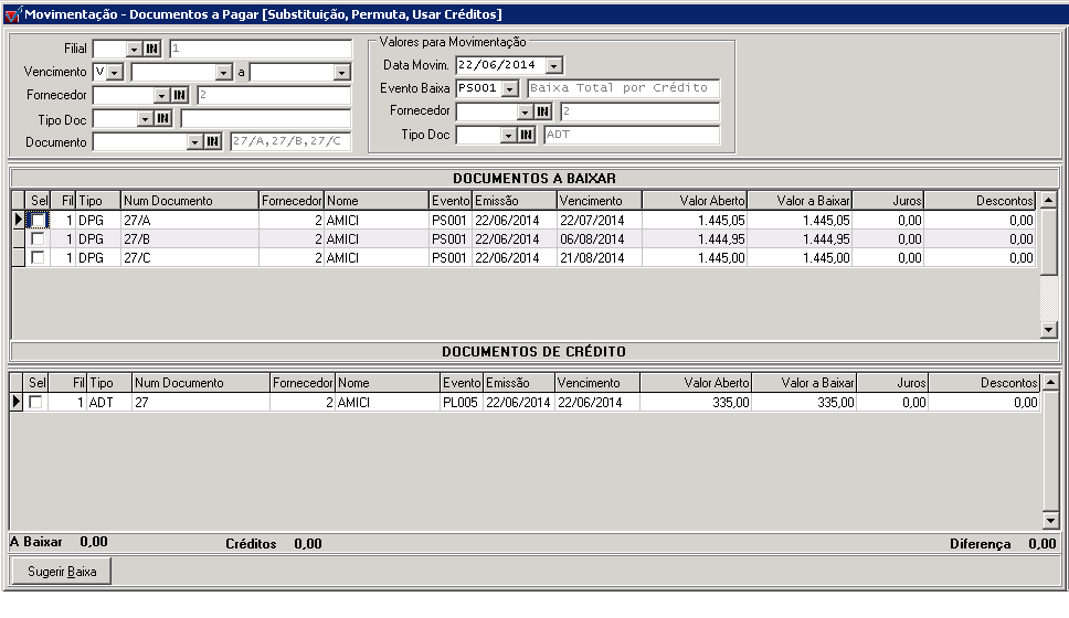 - O botão Sugerir Baixa pode ser usado para que o sistema calcule automaticamente a baixa dos títulos utilizando o crédito disponível
