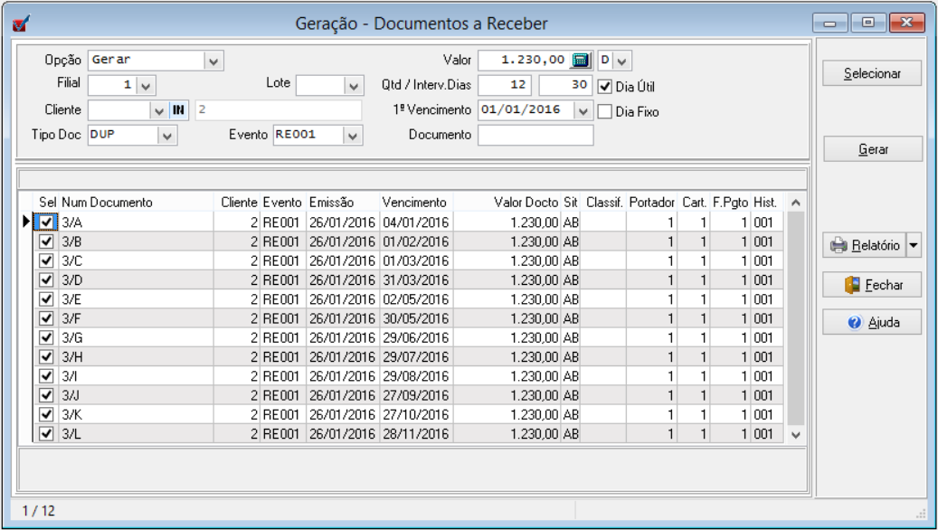 Indica se o dia do vencimento dos documentos deverá ser igual ao dia do 1º vencimento informado na tela, essa opção irá forçar os vencimentos terem em média sempre um intervalo de 30 dias entre eles, portanto ao selecioná-la, o campo Intervalo dias da tela será desabilitado.