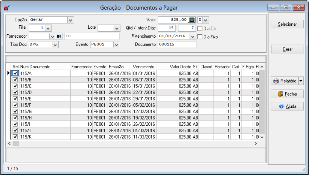 Exemplo: Geração de 15 documentos para o fornecedor 10 no valor de R$ 825.00 cada e com vencimento semanal.