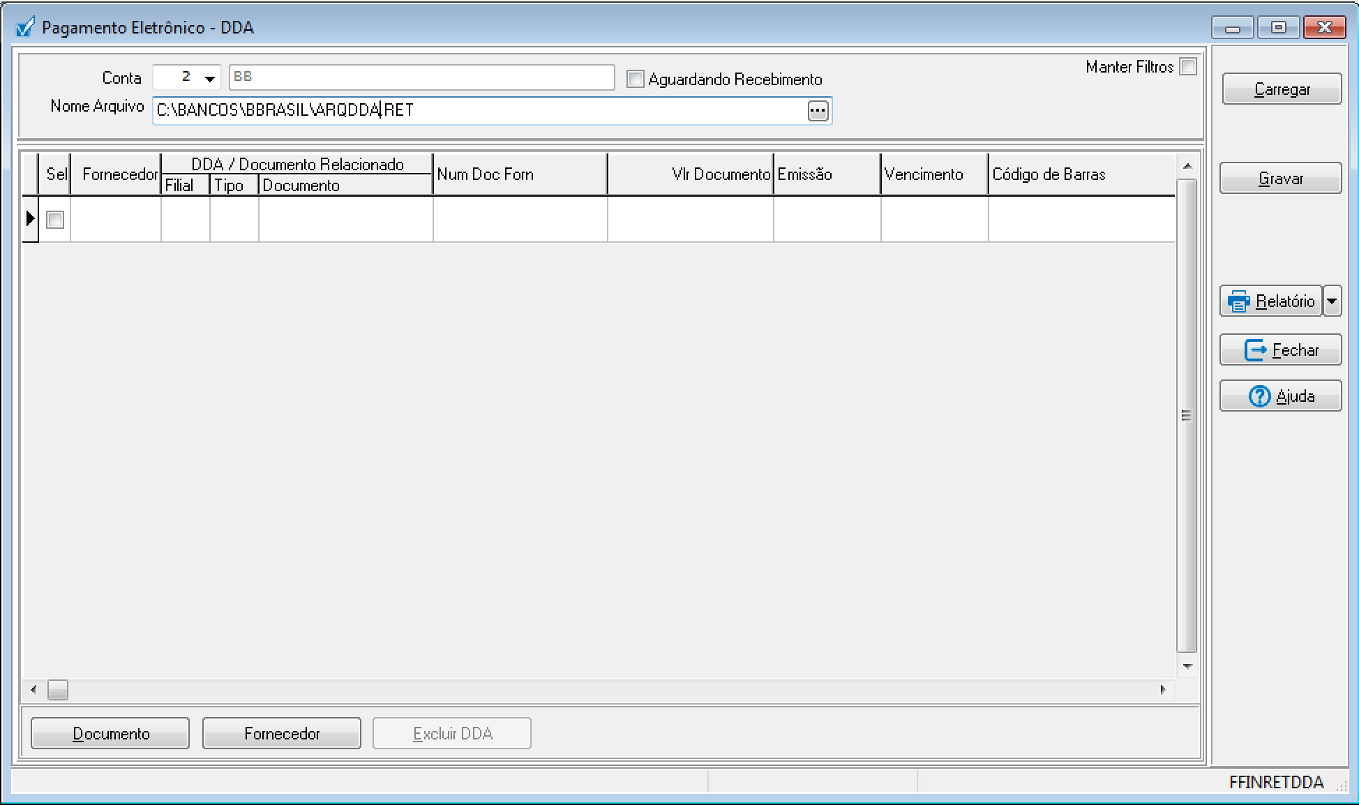 O Objetivo dessa tela é receber o arquivo de DDA disponibilizado pelo banco e verificar se tais documentos ja foram lançados no sistema e atualizar seu código de barras, com isso será possível o agendamento/pagamento do documento via Remessa de arquivo ao banco.