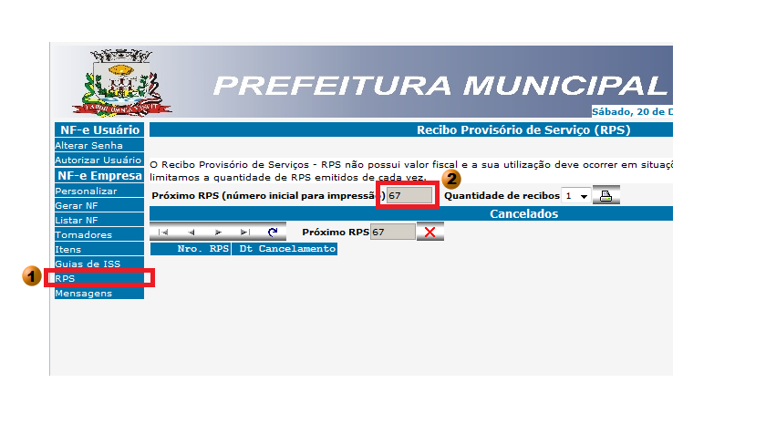 - Anote o número da próxima RPS, à direita, em seguida informe-o no sistema quando solicitado
