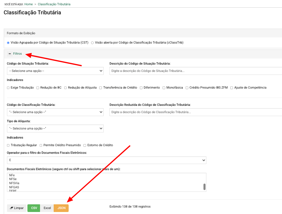 Clique em Filtros e no botão JSON. Salve o arquivo em uma pasta local no computador, e utilize a opção acima (Importar) para atualizar os dados no sistema.
